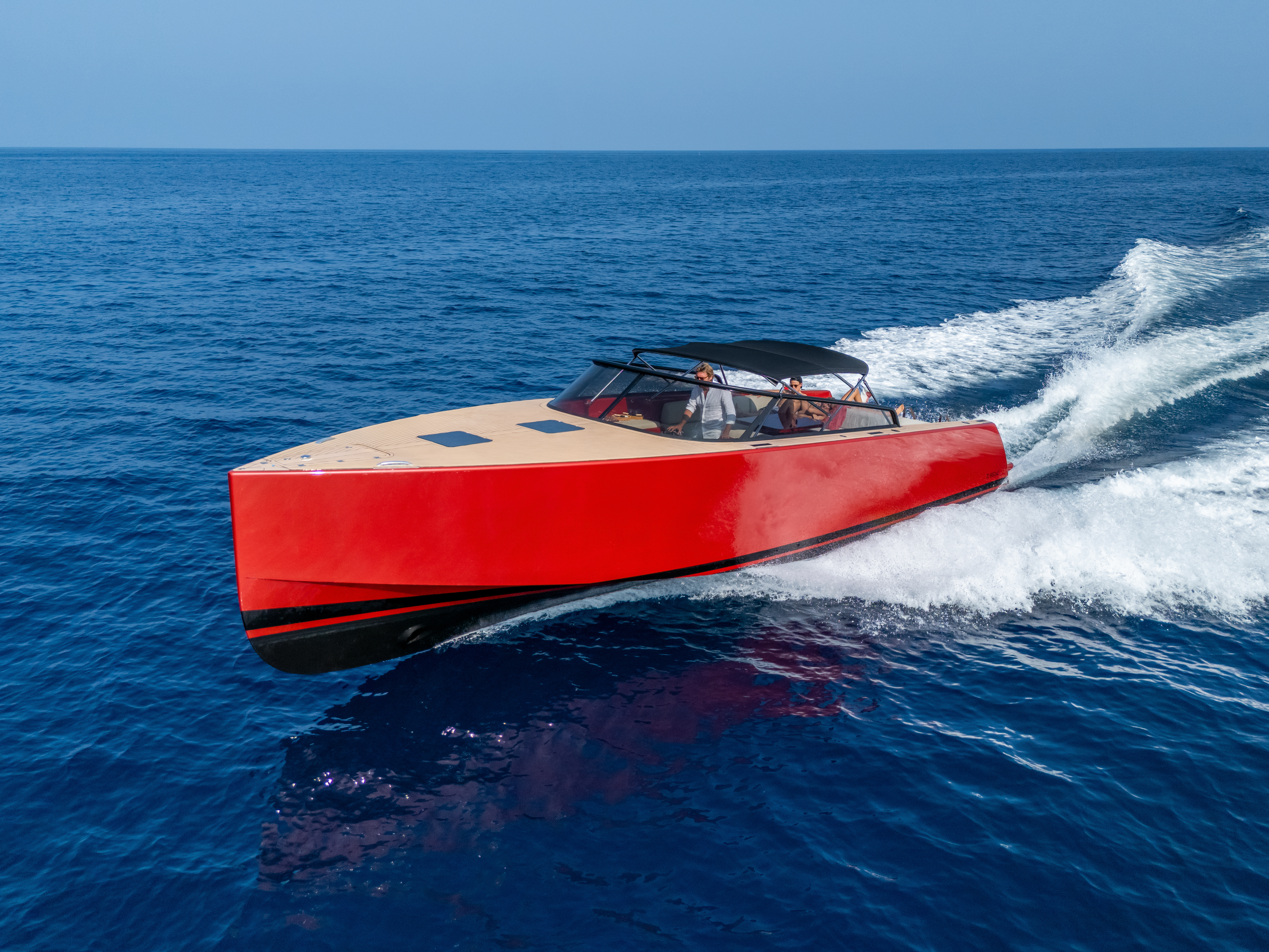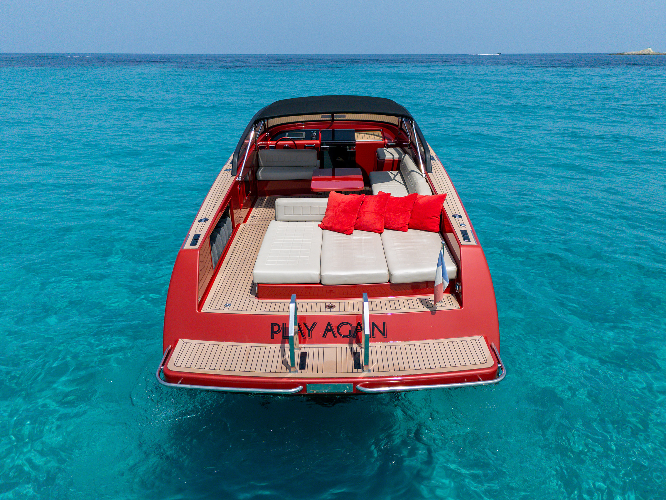 Équipements : Bain de soleil arrière, Taud de soleil cockpit + Extension du taud sur bain de soleil arrière, Grande table de cockpit, Plateforme de bain, système audio premium, réfrigérateur, douche de pont.